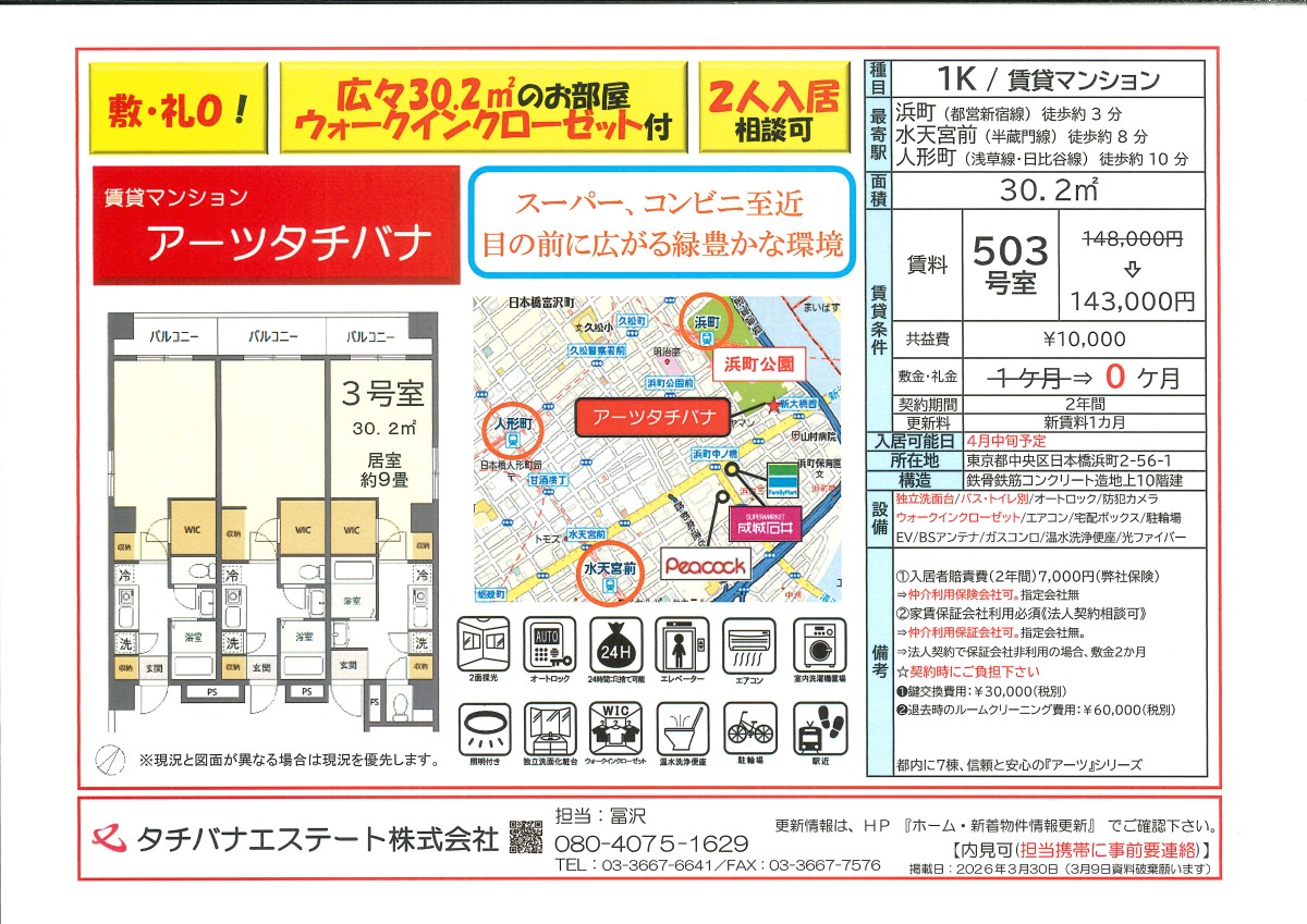 【担当冨沢】アーツタチバナ(日本橋浜町) 503号室《1K》