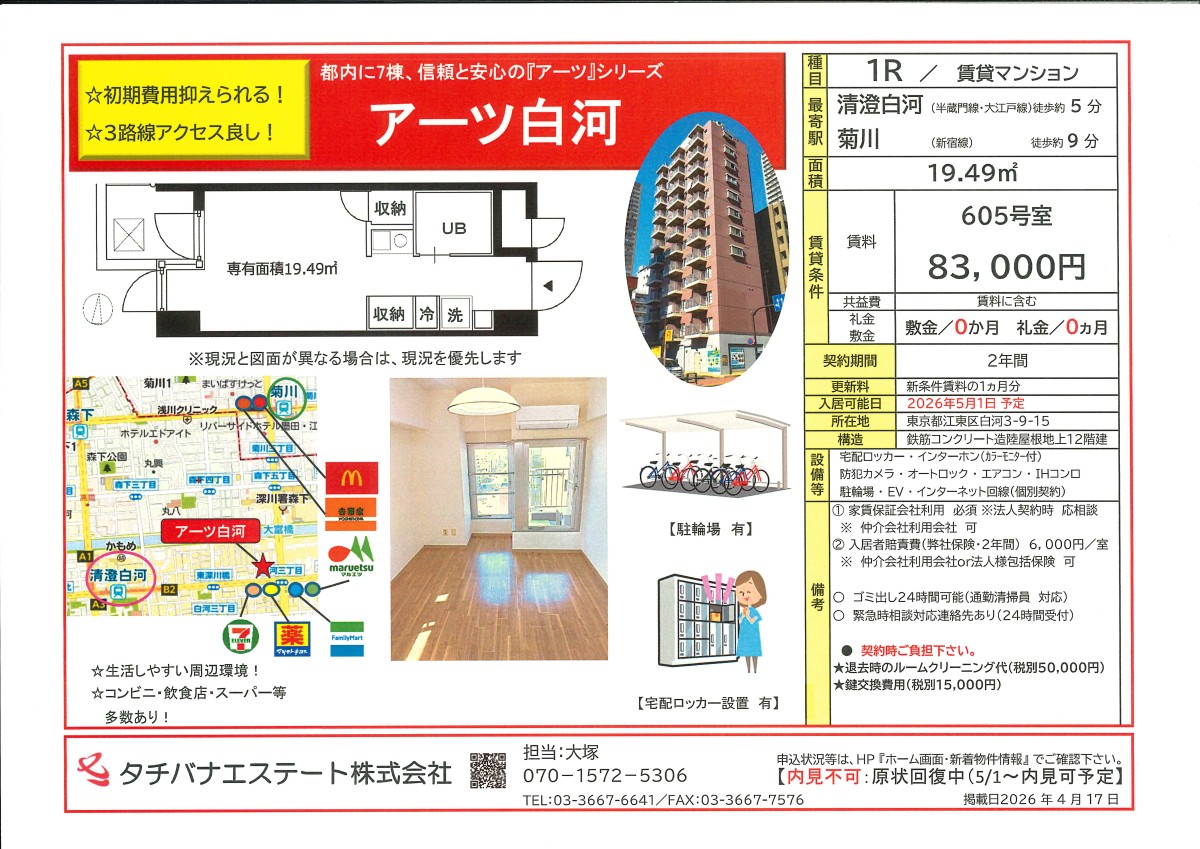 【更新・担当大塚】アーツ白河(清澄白河) 605号室《1R》